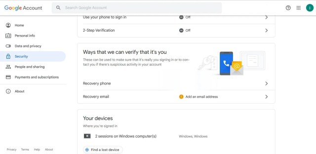 - Click on the “Security” option and then Scroll down and find “Ways that we can verify that it’s you” options to add alternate ways to recover your account.